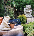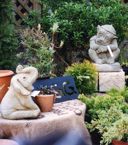 庭を守る西洋のガーゴエル、アイアンバーベキュー台、ウッドゲート。